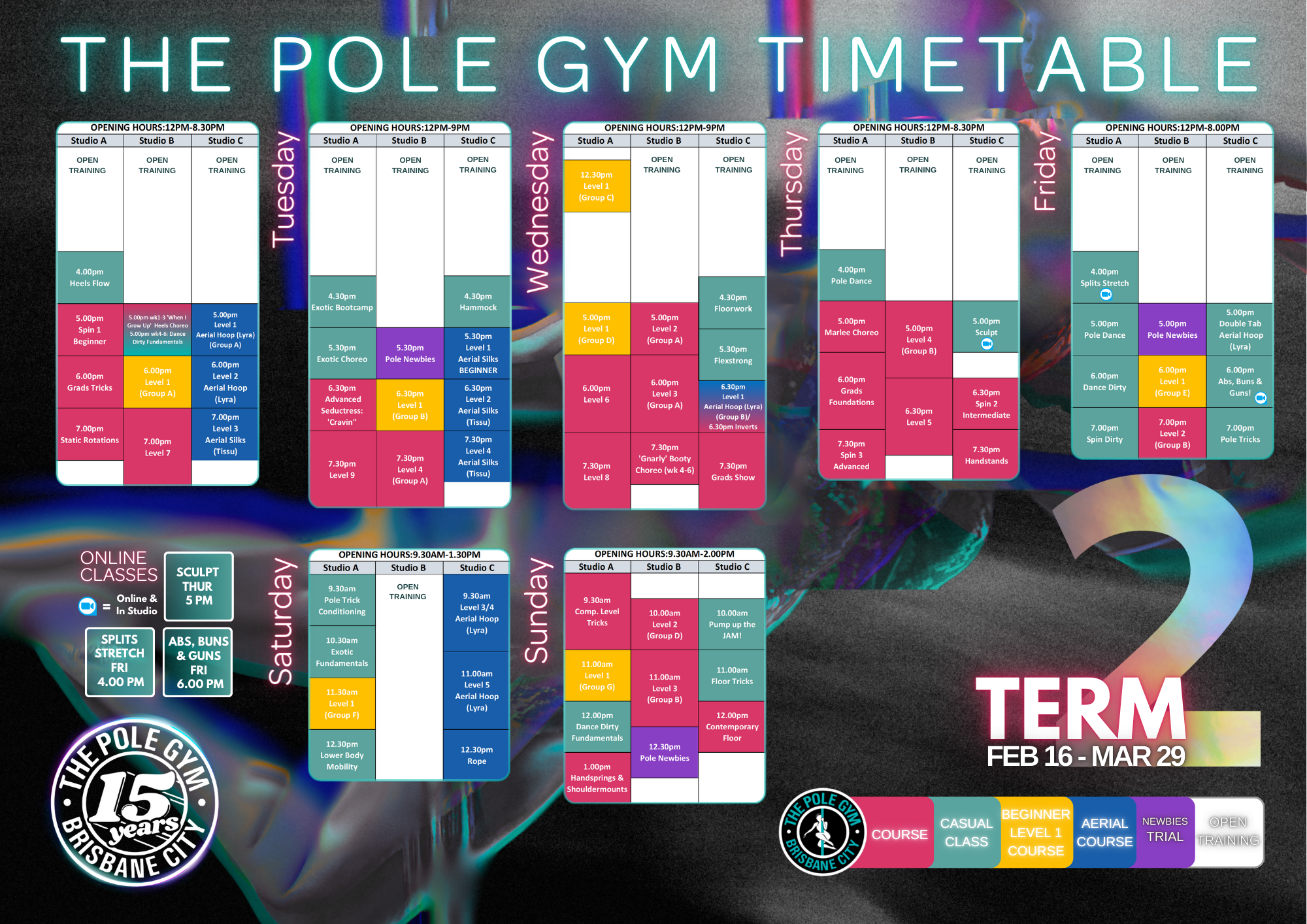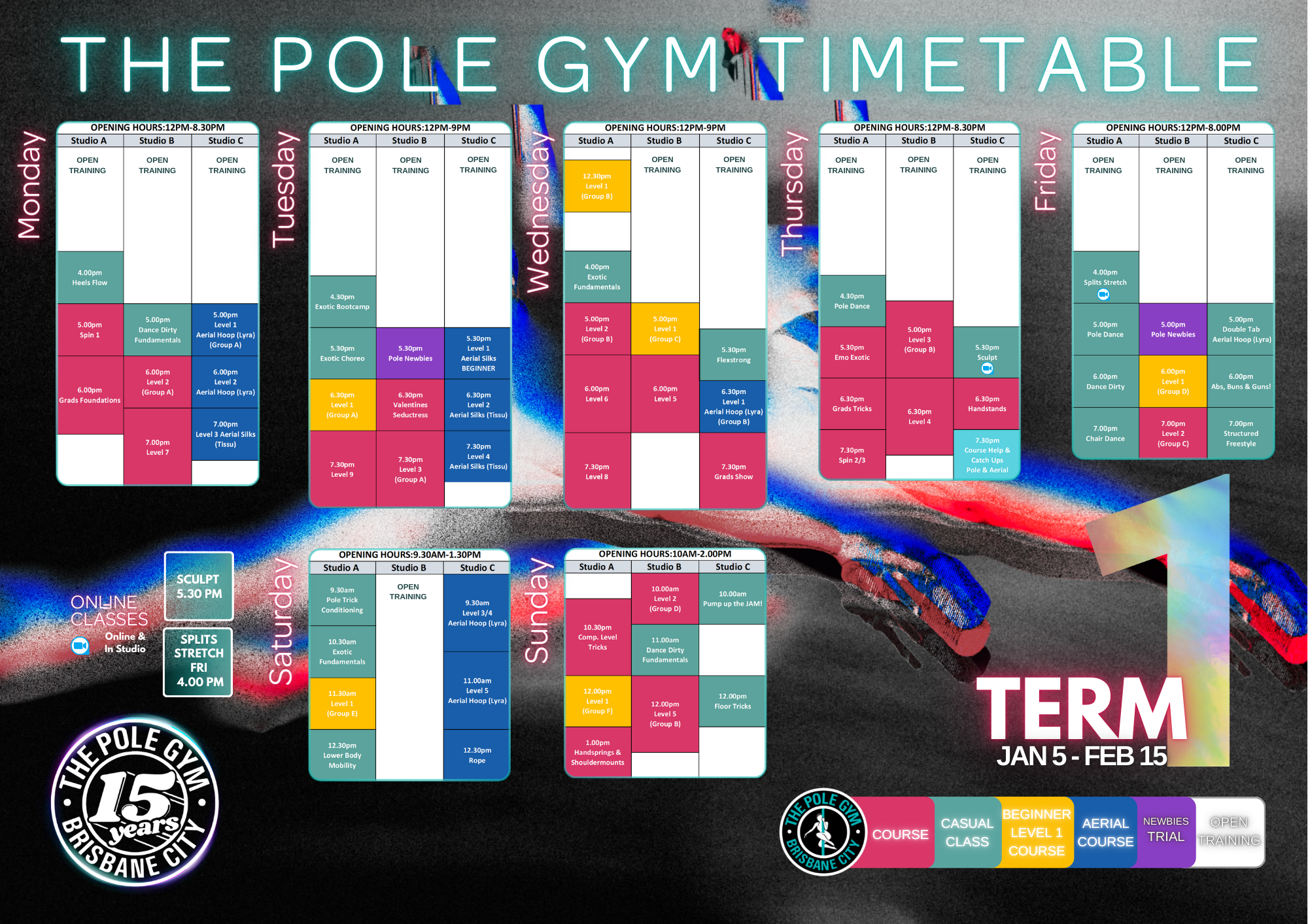 Come to The Pole Gym and forget your traditional workout! We are a fun, inclusive, safe environment with a wide selection of fitness, pole, aerial hoop (lyra), silks (tissu), dance classes and more! Through our courses you will learn a fun and safe progression of tricks and choreography! With classes running 7 days a week and over 20 casual classes on offer, there is something for everyone, in studio or online!